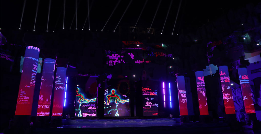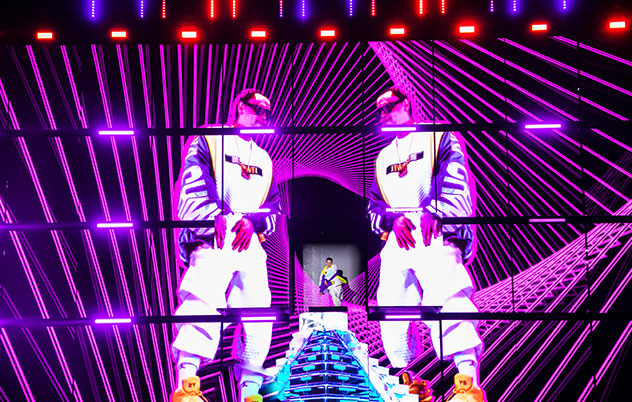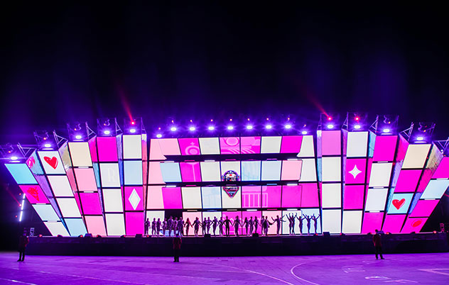 单体3D立体运动模组舞台,舞台宽45米、高11米,由76个方形立体模块组成“魔方矩阵”,每层19块、共4层,每个单体“格子立方体”高2.5米,宽2米,可自由伸缩、旋转运动。